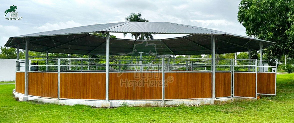 HopeHorse horse training walkers consist of HDG steel frame and durable fence panels in different materials such as bamboo wood, pine wood, HDPE boards, solid plastic boards.