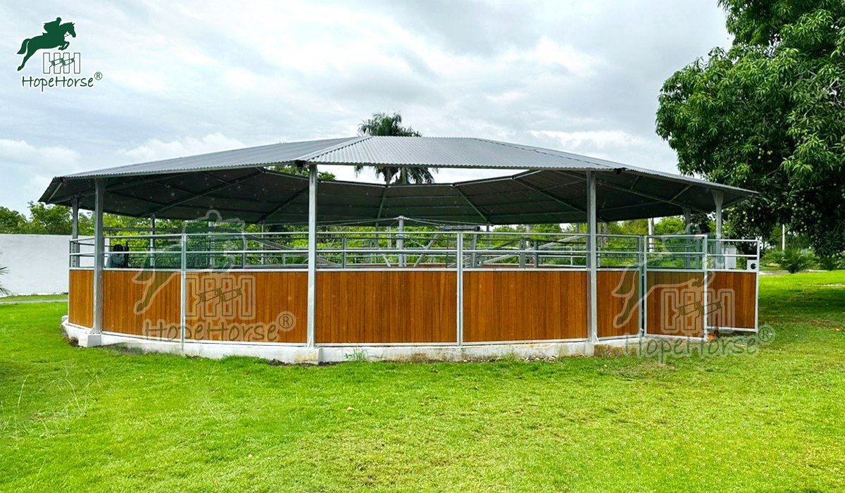 The semi-enclosed roof can effectively shield from sun and rain, ensuring all-weather safe training for horses. The automated horse exercise machine operates stably, which is in line with the physiological habits of horses.