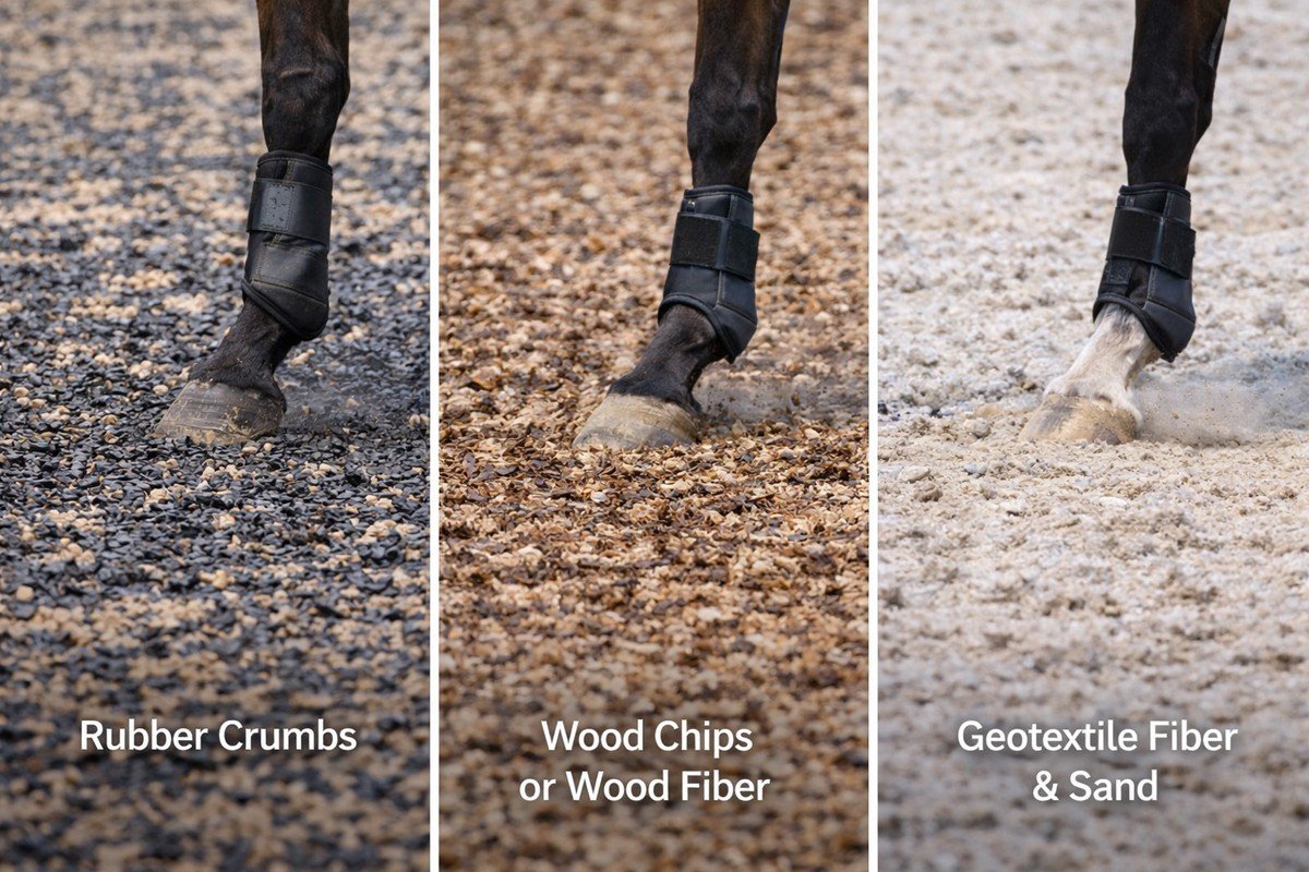 Depending on budget, riding discipline, climate, and maintenance capacity, the top layer may include different material combinations.