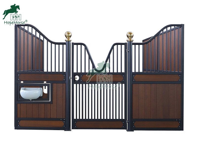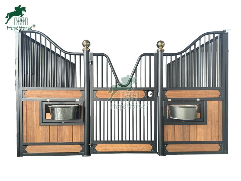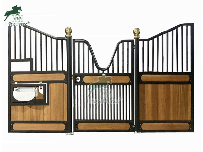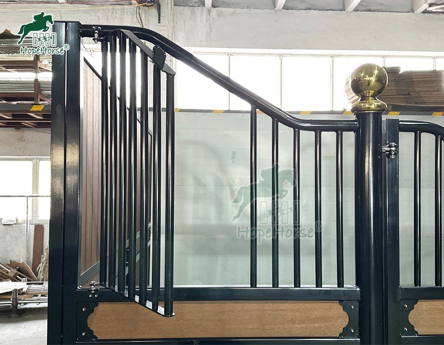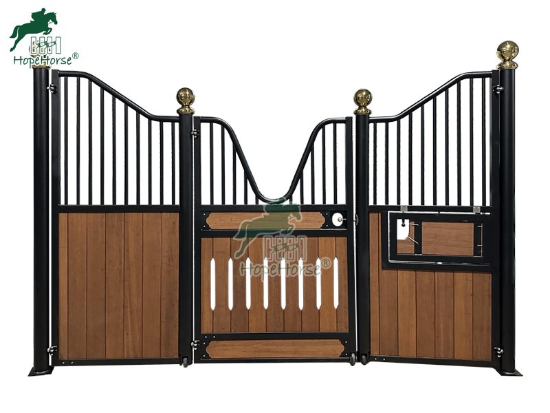 This horse boarding stable design features symmetrical feeding windows, combining functionality and safety for optimal use. The upper section is equipped with closely spaced vertical bars, allowing caretakers to monitor the horses at any time while effectively preventing the horse's head or legs from getting stuck. The feeding windows are thoughtfully positioned for convenient access during feeding, enhancing daily operations. The secure vertical bar spacing also ensures proper ventilation and visibility, creating a stress-free environment for the horses. Additionally, the design's symmetry not only adds aesthetic appeal but also contributes to the structural balance of the horse stable, ensuring durability and long-term usability. | If you wish to enhance the elegance of your horse boarding barns, consider adding copper finials to the posts for a more sophisticated look. To improve visibility of the horse's activity inside the equine stables, the lower section can be designed with a combination of vertical bars and bamboo panels. This hybrid structure not only provides excellent visibility but also ensures the bamboo panels meet strength and durability requirements. The combination of materials adds a touch of natural beauty while maintaining functionality and safety, making the horse stall equipment both practical and visually appealing. | This panel horse stall design is distinguished by its decorative large pillars on both sides, a feature often favored in royal horse barns for its majestic and elegant appearance. The addition of a rotating feeding trough on the right side further elevates its functionality, offering not only a sense of luxury but also exceptional convenience. This thoughtful design allows caretakers to feed the horses efficiently without entering the stall, saving time and ensuring safety. The combination of aesthetic appeal and practical features makes this stall door design an ideal choice for those seeking both sophistication and usability. |