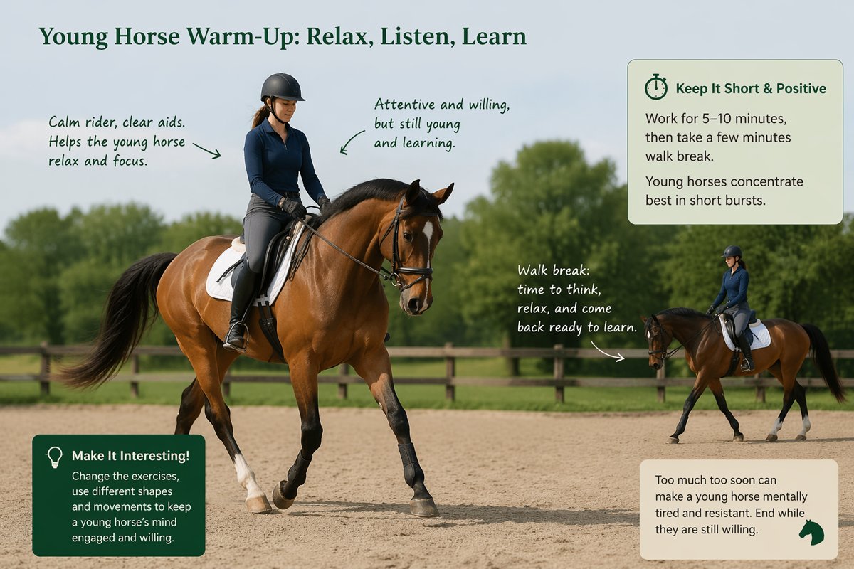Both the warm-up and the work itself should remain interesting and varied. Excessive repetition or overly long sessions can make a young horse mentally sour and reduce willingness to work in the future.