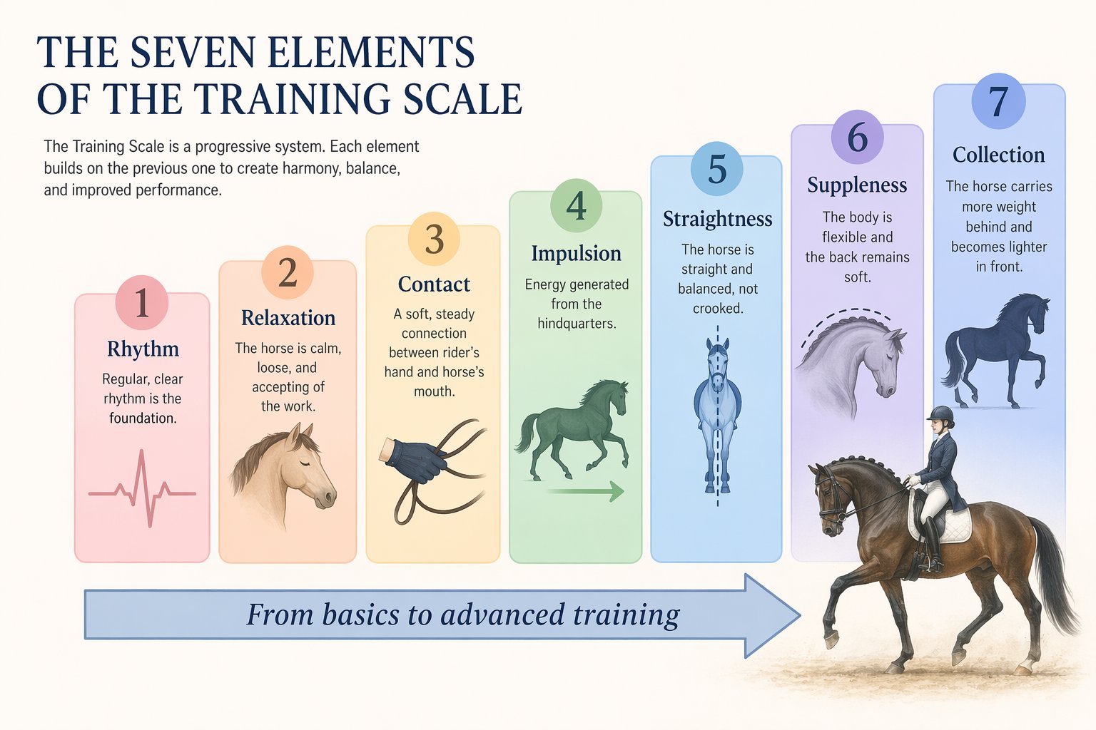 In classical equestrian training and dressage, this is often described through the Training Scale, which includes several key elements developed in a logical order: