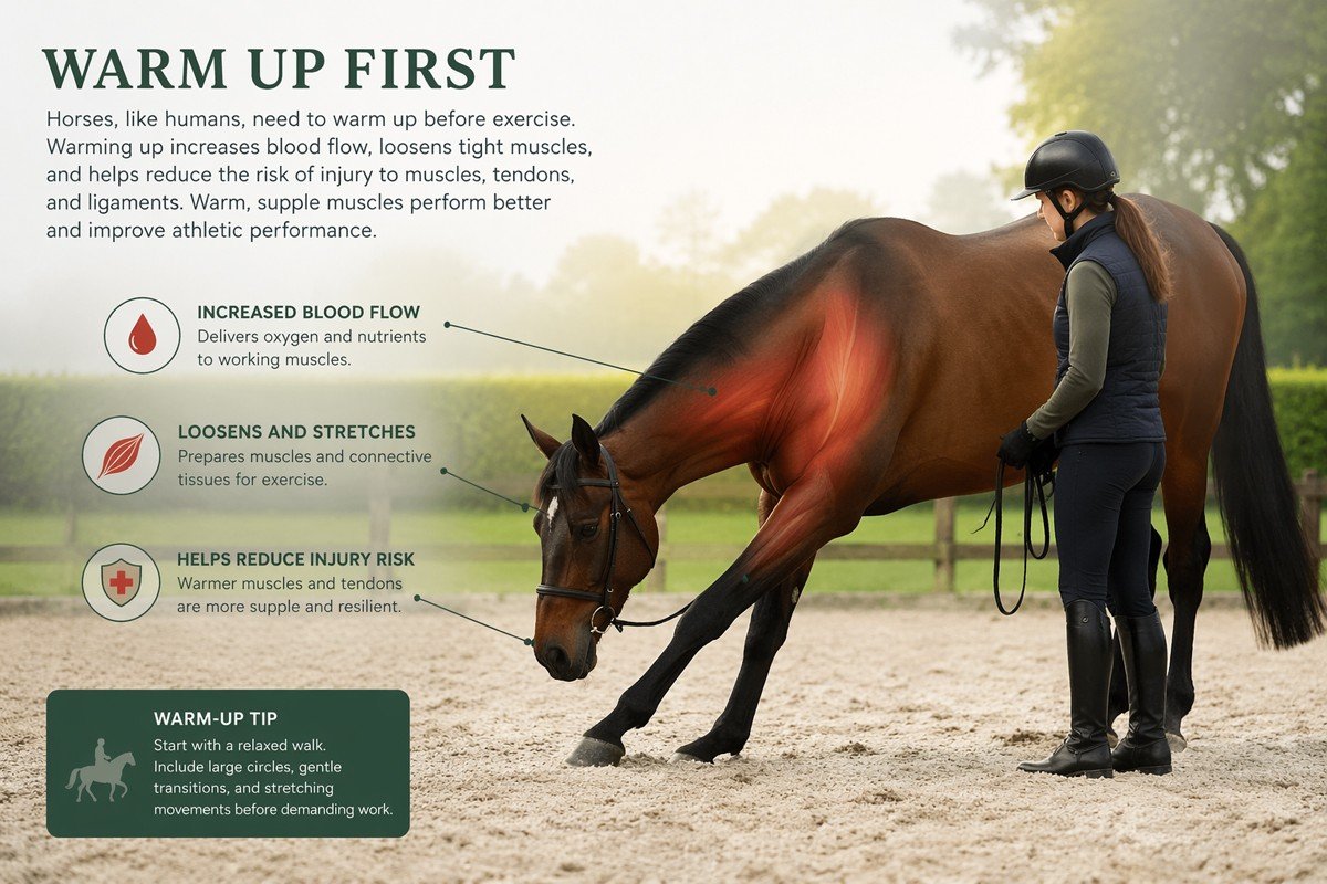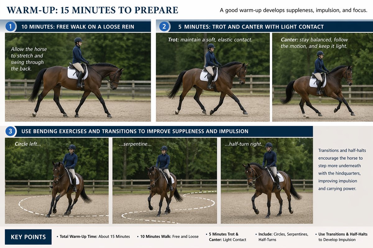 Warming up is far more than simply letting the horse walk for a few minutes. It is a structured process that helps prepare both the horse's body and mind for work.